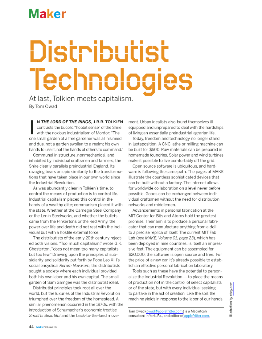 Techno-Distributism is a Distributism that has left the outdated agrarian metaphor behind in favor of the ways in which new technologies (e.g., desktop manufacturing) lend themselves to the distributist model. This was first proposed in Make magazine. Personal means of production in this era has less to do with acres of land and more to do with how much compute power and data one has.